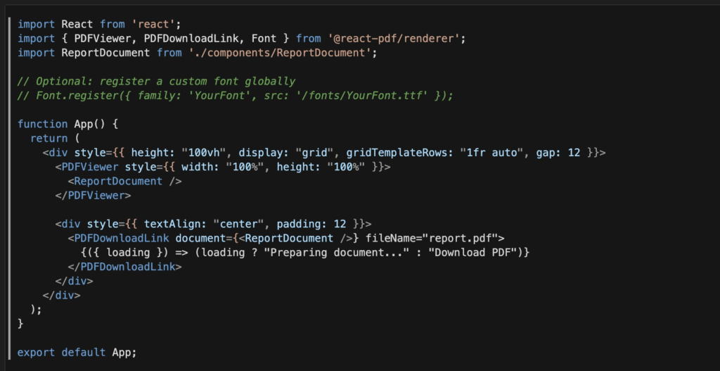 In modern web applications, generating professional PDF documents is a common requirement—think invoices, reports, certificates, contracts, and more. React PDF Renderer brings the familiar React component model to PDF generation, making it easy to design documents using JSX, styles, and a declarative approach.