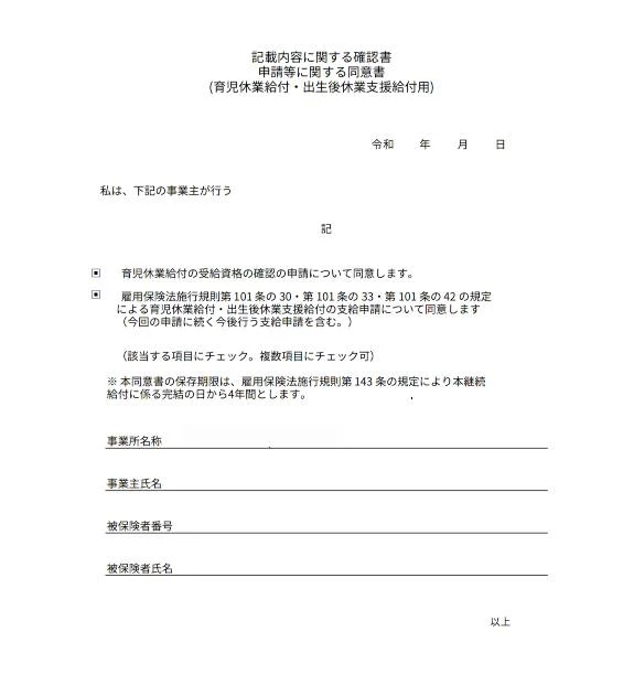 雇用保険法施行規則第 101 条の 30・第 101 条の 33・第 101 条の 42 の規定による育児休業給付・出生後休業支援給付の支給申請について同意します(今回の申請に続く今後行う支給申請を含む。)